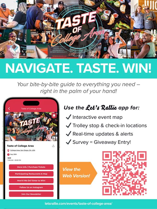 Our favorite culinary event of the year, Taste of College Area, will be held on Sunday, September 28, 2025 from 11AM to 3PM. Join us to sample some of the best bites and sips from College Area's diverse eateries. The afternoon will showcase a world of different restaurants, each just as delicious as the last.